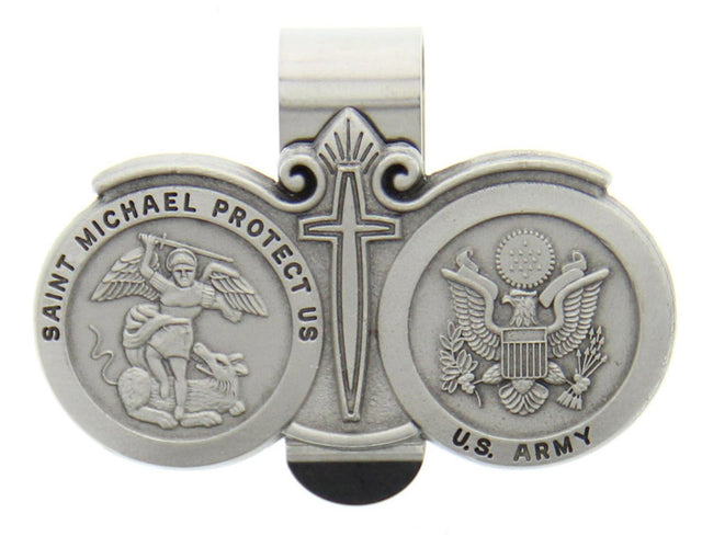 A special visor clip for your Army service member. This St. Michael U.S. Army visor clip features side by side round silver medallions of St. Michael and the U.S. Army emblem separated by a cross at the center.