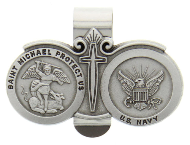 Prayer for their safety on land and at see. This St. Michael U.S. visor clip features side by side round silver medallions of St. Michael and the U.S. Navy emblem separated by a cross at the center.