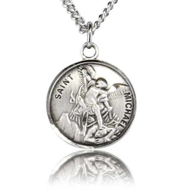 or Youth Round St. Michael Medal for Women - Sterling Silver / 3/4" Diameter / 18" Surgical Stainless Steel Medium Curb Chain with Clasp is backordered and will ship as soon as it is back in stock.
