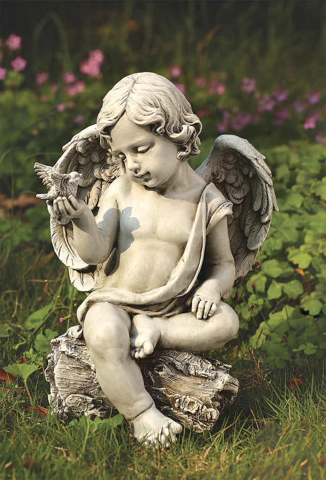 Angel Cherub with Dove Garden Statue - 12 inch - Stone Finish / 12" is backordered and will ship as soon as it is back in stock.