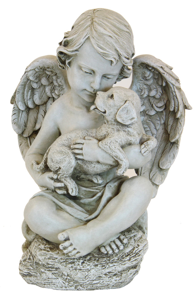 What is a more adorable image than this? A cherub angel delicately holding a puppy. The angel is seated with legs crossed and wings stretched outward. At 12 inches tall, this statue is sized to fit in any part of your garden.