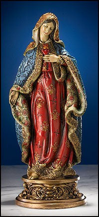 An elegant and unique statue of the Immaculate Heart of Mary. From every angle she is simply stunning. The design is a classic one that combines embossed textures and brocade patterns. This statue is finely crafted and hand painted with vibrant colors. Every detail is pleasing from her beautiful facial expression to her flowing robes and careful sculpted lines. This statue is a gift of the spirit and the eye!