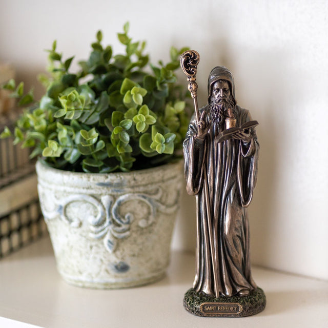 St. Benedict Statue, Bronzed Resin - 8 inches