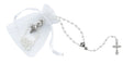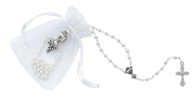 This is a First Communion PIN and ROSARY set featuring a pretty Chalice shaped pin that can be worn on the day of the Sacrament and a petite white bead communion rosary. The rosary features a 4mm round white faux pearl glass bead, a chalice centerpiece and an elegant crucifix.