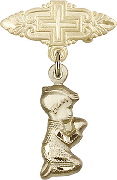 Praying Boy Charm and Badge Pin with Cross - 14K Solid Gold / 1 1/8" x 3/4" is backordered and will ship as soon as it is back in stock.