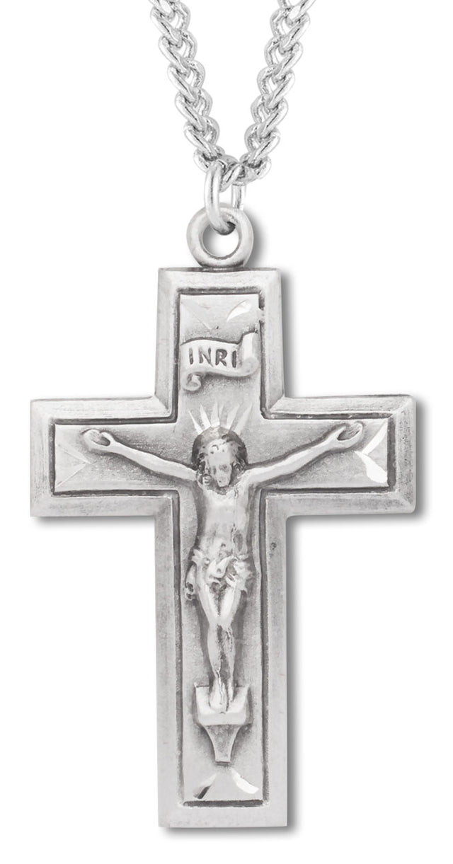This sterling silver crucifix is a wonderful blend of contemporary and traditional styling with is strong squared beveled edges and raised corpus.