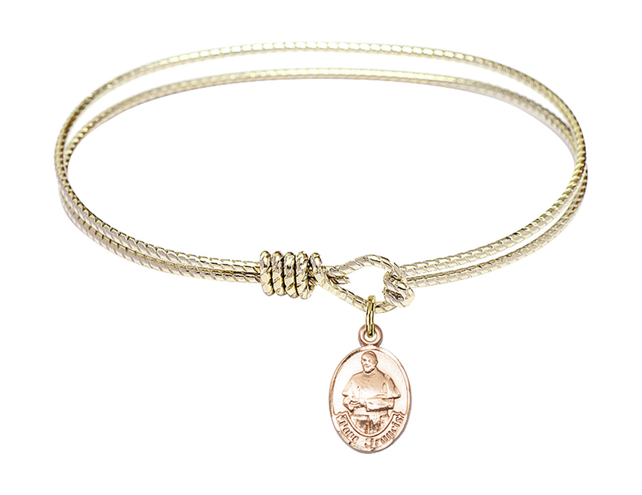 Pope Francis charm in an oval shape and border text that reads Pope Francis. Paired with a cable bangle bracelet.