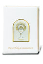 This is a heirloom keepsake from the Salerni Sterling of Italy collection. It features a padded white leatherette Trinity Missal with gold gilded edges and a Sterling Silver Salerni plate on the cover. The Sterling Silver plate features a First Communion Chalice. This is a timeless gift that can be passed down and treasured for years to come.