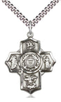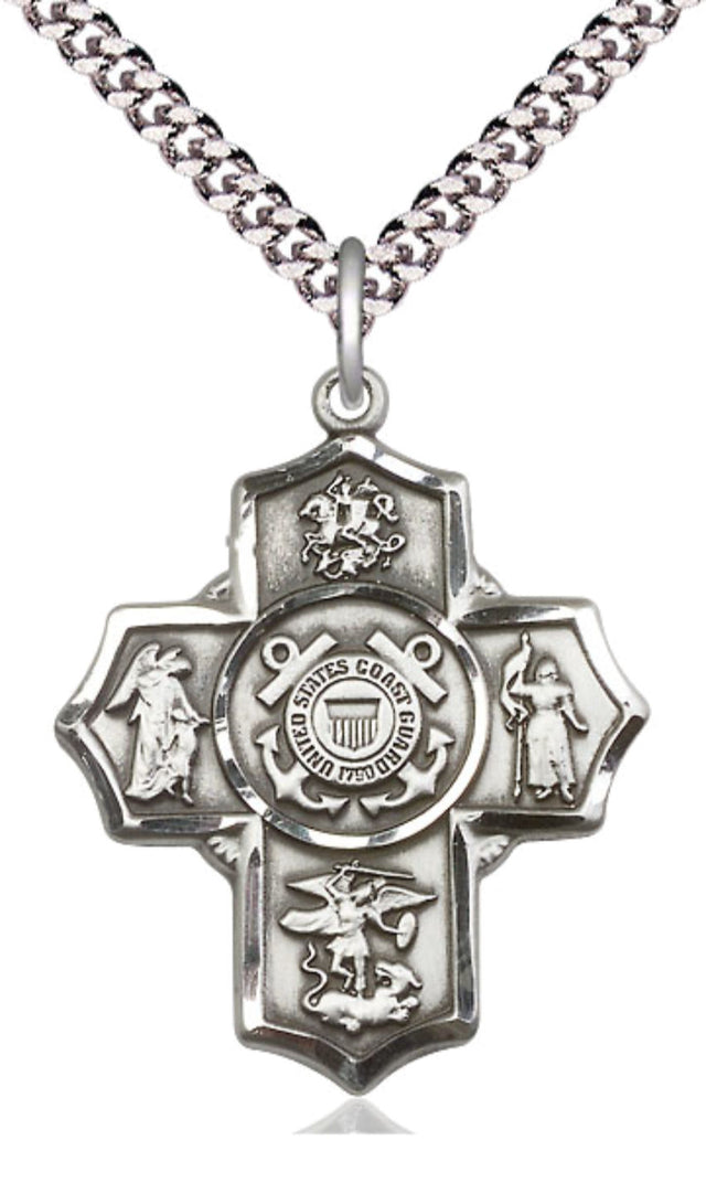 Wide-tip 5 Way cross pendant with the US Coast Guard insignia in the center. At each tip are the classic patron saints for the military and include St. George, St. Michael, St. Joan of Arc and a Guardian Angel.