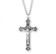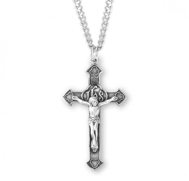 This crucifix is a perfect choice if you are looking for a simple design that has an antique gothic feel. The design incorporates a blackened silver oxidized background, a large IHS lettering behind the head of Christ, simple cross bar tips and a matte finished corpus.