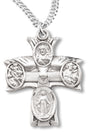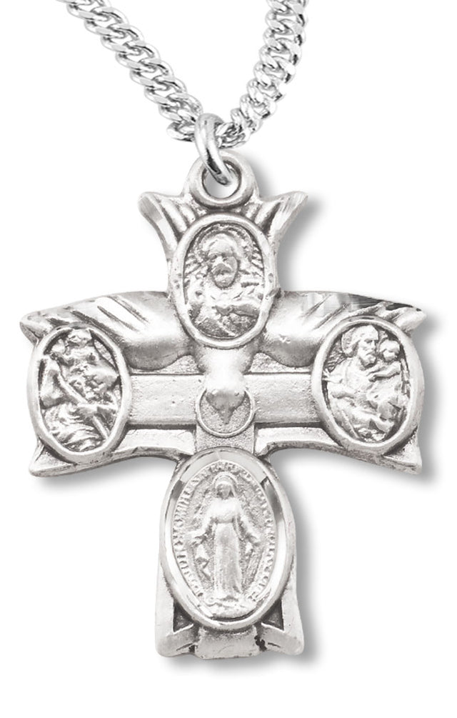 This isn't just another 4 Way cross pendant! Look at this pendant closely and you'll see that the top of the cross is in the shape and design of a dove whose wings span the top edge of the cross. The dove, representing the Holy Spirit. The size is perfect as a Confirmation gift. The front corners display an image of Jesus the Scapular, St. Joseph, St. Christopher and the Miraculous. On the back side are images of Mt. Carmel, St. Joseph, the infant of Prague, and the Miraculous symbol.