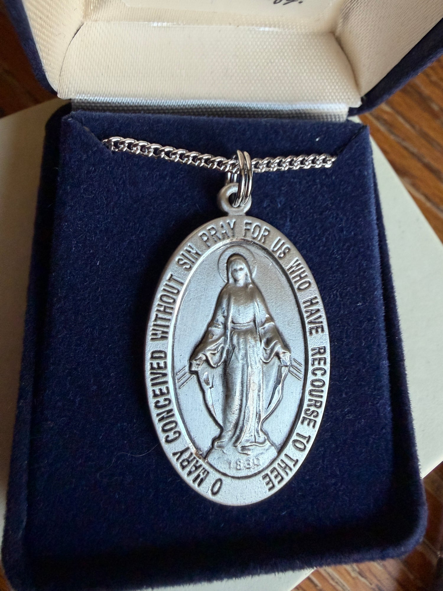 There is no better way to honor our Blessed Mother than by wearing her close to you every day. This oval shaped pendant is a very nice size and as such the details are amazing! The size of this pendant is large, please keep that in mind when ordering.