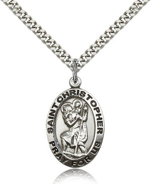 Men's Oval St. Christopher Pray For Us Medal - Sterling Silver / 24" Light Rhodium Heavy Curb Chain with clasp (2.9mm) is backordered and will ship as soon as it is back in stock.