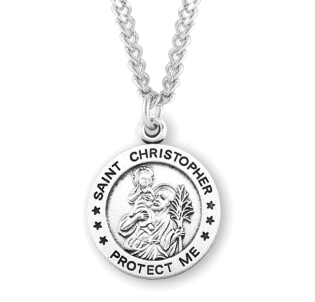With Saint Christopher being the patron saint of travelers, what better devotional medal to wear on your next trip than this classic round sterling silver St. Christopher pendant with the words ' SAINT CHRISTOPHER PROTECT ME' on the border.