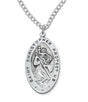 An oval Saint Christopher necklace with a sterling silver pendant has a classic shape and design. On the border, the text reads Saint Christopher Protect Us.