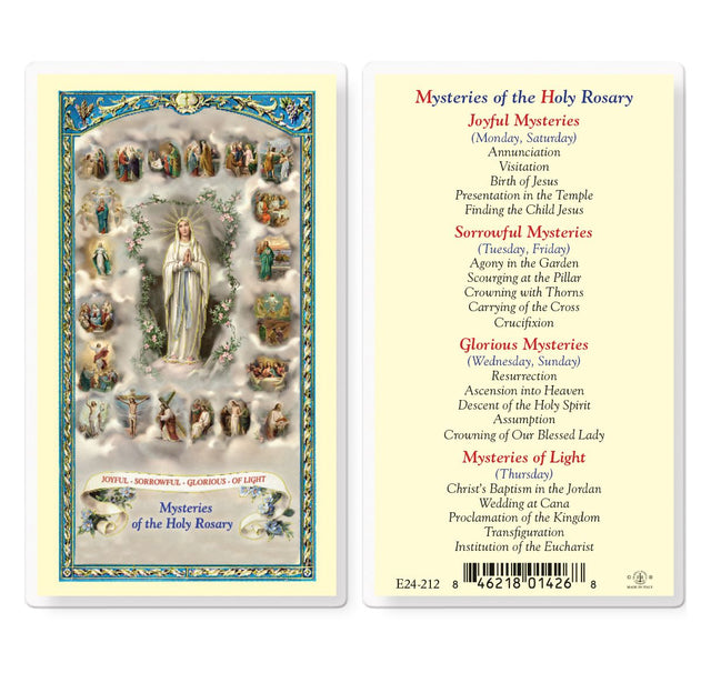 Mysteries of The Rosary Laminated Prayer Card - 1 Prayer Card .99 each / 4 1/2" x 2 1/2" is backordered and will ship as soon as it is back in stock.