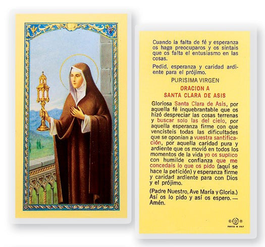 Spanish prayer card in memory of St. Clare and her work with the poor.