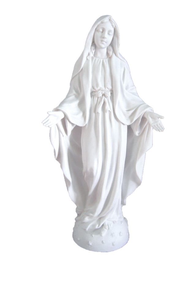 This magnificent Our Lady of Grace statue has been created from white hand painted resin. She has been crafted with much attention to detail and the linear contour lines are amazing! This glorious statue would make a great addition to your indoor or outdoor decor.