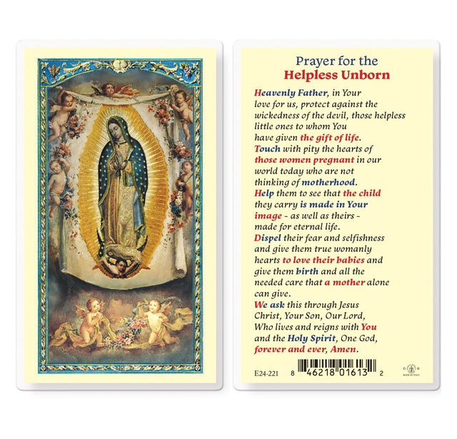 When praying for pro-life causes and for the protection of the unborn children, say this prayer. On the front is an image of Our Lady of Guadalupe and on the back a prayer for the helpless unborn.