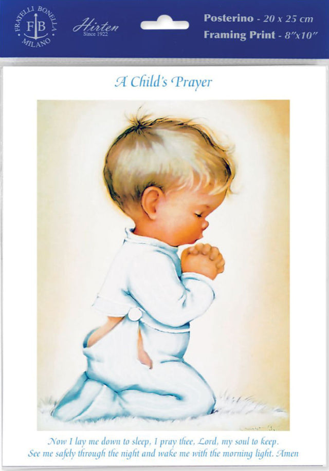 This Praying boy print includes the tender nighttime prayer; Now I lay me down to sleep. Simply adorable! These prints are ready to frame and measure 8' x 10'. Print is made in Italy and printed in Milan by Fratelli Bonella. Each pack includes three prints. Excellent quality paper.