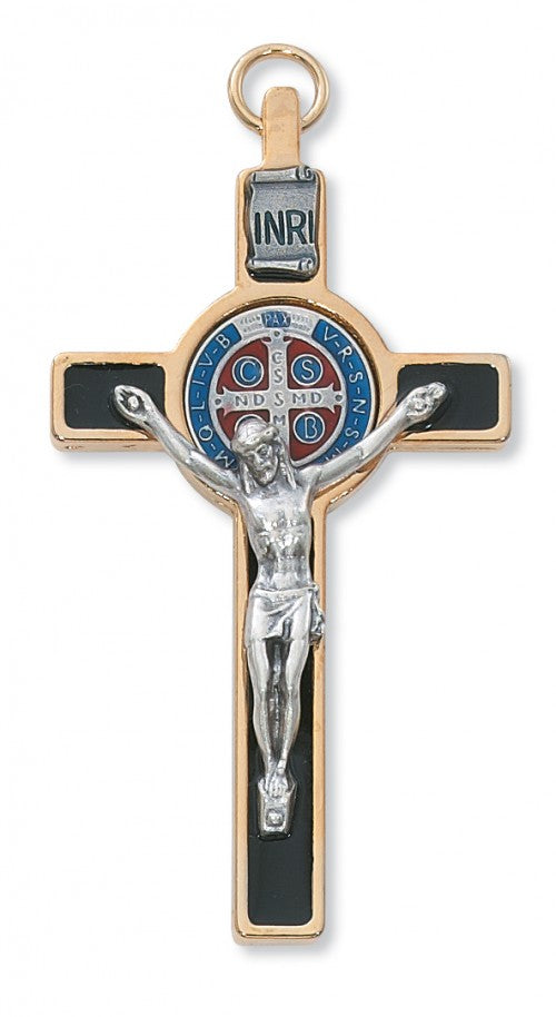 This St. Benedict crucifix has a black enamel front with a multi-colored background and gold-tone trim and a silvertone corpus. Can be worn as a large pendant or used as a small wall crucifix.