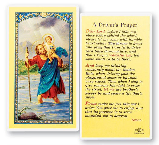 A prayer card to keep drivers safe includes an image of St. Christopher on the front and the prayer on the back panel.