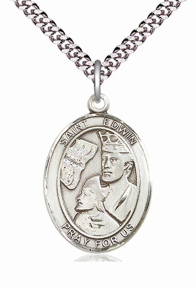 St. Edwin Pendant. Patronage: Homeless People. Each medal comes gift boxed. The sterling silver medal and gold filled medals come with a matching chain. Larger medal comes with a matching 24' 'heavy curb' chain. Smaller medal comes with a matching 18' lite curb chain. The 14KT gold medal does not come with a chain. Handmade in the USA.